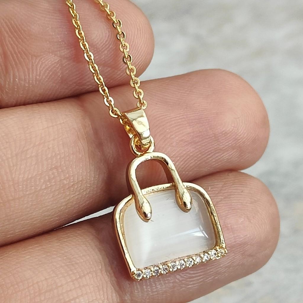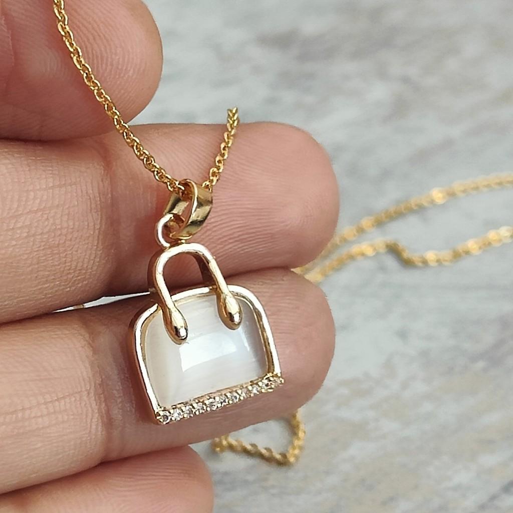 The pendant is in the shape of a handbag, which adds a touch of elegance and sophistication to the piece. The handbag shape is a unique and stylish design that is sure to make a statement. The pendant is also plated with 18k gold, which adds a luxurious and elegant look to the piece.